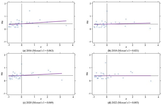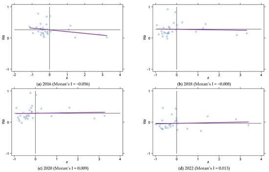 In addition, Moran scatter plots can be constructed to illustrate the dissemination or polarization between an area and its neighboring regions.