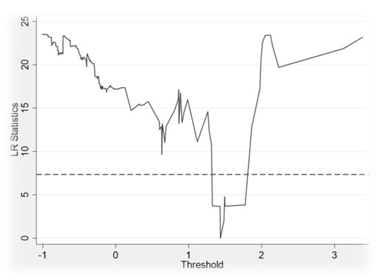 Drawing the likelihood ratio function (LR) diagram by Stata 17.0 can more accurately reflect the construction process of threshold values and confidence intervals. Figure 6 shows the estimation value for single thresholds and its confidence intervals. The estimate of the threshold parameter is the value taken when LR equals 0, and 1.4339 in the single-threshold model. The 95% confidence interval for this threshold is the interval formed by the critical value of 7.35 for all LR values less than the 5% significance level (see Figure 6).