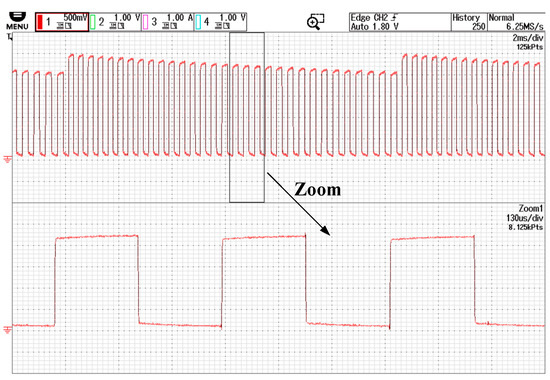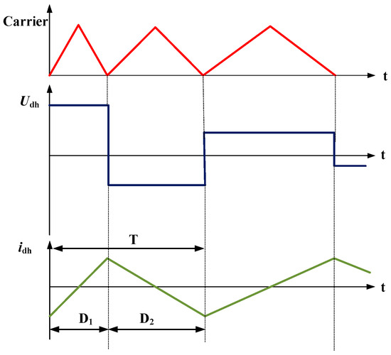 Figure 7 illustrates the periodically frequency-modulated square-wave signal used for injection. The carrier’s center frequency is set to 5 kHz, varying between 4.5 kHz and 5.5 kHz. The injected square-wave signal is generated from the carrier signal by changing both the polarity and period of the square wave each time an interrupt is triggered. This ensures that adjacent positive and negative injection signals have different periods, thereby enhancing the spread-spectrum effect. Consequently, the center frequency of the injected signal is 2.5 kHz. To satisfy volt-second balance, the amplitude of each square wave is inversely proportional to its period.