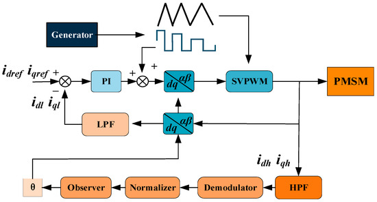 The square-wave injection is implemented along the d-axis with a high-frequency signal, where the injection frequency in this study is set to half of the switching frequency. When injecting high-frequency voltage into the d-axis, the resulting high-frequency current predominantly manifests in the