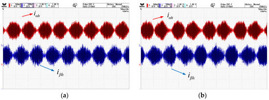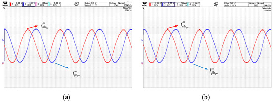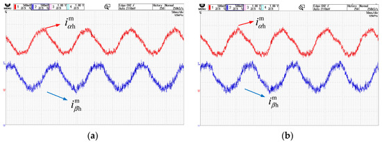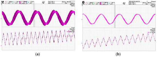 Figure 8a,b show the phase current waveforms after high-frequency signal injection based on periodic frequency modulation under no-load and loaded conditions, respectively. The waveforms include both the fundamental signal and high-frequency components.