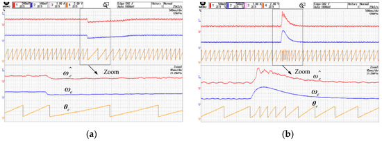 Figure 13b shows the variations in speed and angle when the system shifts suddenly from loaded to no-load conditions. Based on the observed speed and angle dynamics, the sensorless control system rapidly regains stability after disturbances, demonstrating the robustness of the proposed periodic frequency modulation-based sensorless control framework.