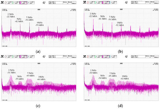 Based on the analysis of the tables and figures, the following conclusions can be drawn. The proposed periodic frequency modulation-based sensorless control algorithm demonstrates certain effectiveness in noise suppression. An analysis of the first, second, and third harmonics of the injection frequency reveals that the first harmonic (fundamental frequency) corresponds to the injection frequency and exhibits the highest noise level. The second harmonic represents switching frequency-related noise, while the third harmonic arises from odd-order harmonics induced by the injection frequency. The fourth harmonic, associated with double the switching frequency, has similar suppression principles to those of switching frequency noise and is not discussed in detail.