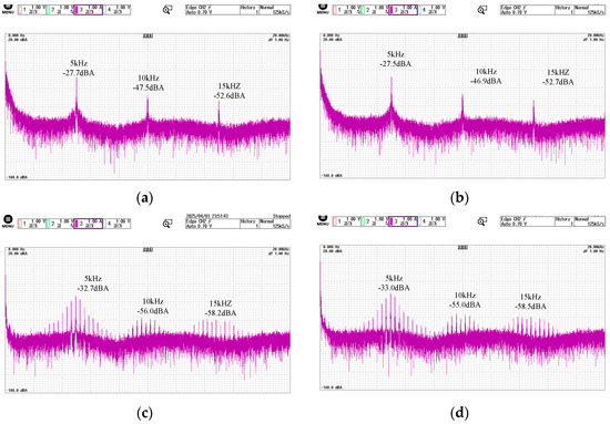 First, comparing loaded and no-load conditions, the spectral distribution and noise suppression performance of the algorithm show minimal sensitivity to load variations. Second, among different harmonics, the suppression effect is most pronounced for the second harmonic (switching frequency). Finally, comparing switching frequencies, the noise suppression at 5 kHz outperforms that at 10 kHz. This indicates that noise reduction depends on both spreading width and spreading depth. Smaller periodic modulation steps within a reasonable spreading width can more effectively disperse spectral energy. The final performance requires a balanced consideration of these two factors.