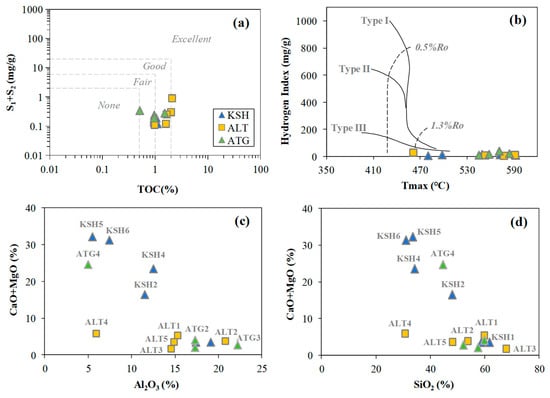 The major elements presented in Table 2 are dominated by Si (29–68%, SiO2) and Al (5.5–22.2%, Al2O3) for mudstone samples (KSH1, KSH3, ALT1–5, and ATG1–3), and Si (31–60.3, SiO2), Al (5.48–15.2, Al2O3) and Ca (3.42–30.4, CaO) for calcareous mudstone samples (KSH2, KSH4–6, and ATG4) (Table 2). The calcareous mudstones rich in carbonates are indicated by the greater values of CaO and MgO than the sandy and shaly mudstones (Figure 3c,d).