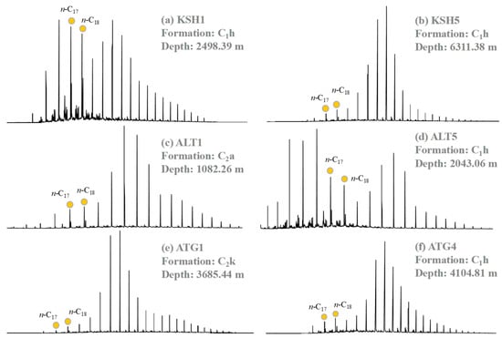 Figure 4 shows the typical mass chromatographs of n-alkanes and acyclic isoprenoids for hydrocarbons extracted from the Carboniferous source rocks. The main peak of n-alkanes is usually located at n-C14–n-C16 and n-C21–n-C24 (Figure 4). The OEP value is 0.65–1.39, the CPI value is around 1.00 (Table 3). The Σn-C21-/Σn-C22+ value is generally greater for samples from the Kushanhe and Altash outcrops than those samples from the Aitegou outcrop. The Pr/Ph ratio is <1.0 and lower for samples from the Aitegou Outcrop (Table 3).