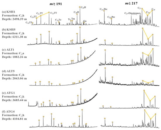 The representative mass chromatograms of terpanes (m/z 191) and steranes (m/z 217) for the rock extracts from the piedmont of southwestern Tarim Basin.