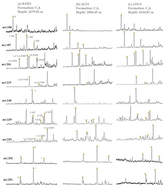 An Agilent 7890A-GC/5975C-MSD (Agilent Technologies, Santa Clara, CA, USA) was used for the analysis of aromatic hydrocarbons. The separation was conducted using an HP-1MS capillary column (30 m × 0.25 mm × 0.25 μm) (Agilent J&W Scientific, Folsom, CA, USA). The oven temperature program was as follows: an initial temperature of 50 °C held for 1 min, ramped to 120 °C at 20 °C/min, then to 310 °C at 3 °C/min, and held for 15 min. Helium was used as the carrier gas with the flow rate of 1.0 mL/min. The mass spectrometry conditions included EI mode at 70 eV, an ion source temperature of 300 °C, and a mass scanning range of m/z 50~500. Full scan and SIM GC–MS analyses were performed to identify the aromatic compounds. During SIM GC–MS analysis, ions were monitored at m/z 154, 168, 182 for biphenyls, m/z 142, 156, 170, 184 for naphthalenes, m/z 178 and 192 for phenanthrenes and anthracenes, m/z 184, 198, 212 for dibenzothiophenes, m/z 168, 182 for dibenzofurans, m/z 166 and 180 for fluorenes, m/z 231 for triaromatic steranes, m/z 202 and 216 for fluoranthenes, pyrenes and benzofluorenes, m/z 228 and 242 benzoanthracenes and chrysenes, and m/z 252 for benzofluoranthene and benzopyrenes.