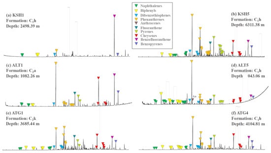 The aromatics in the extractable organic matter of Carboniferous source rocks are composed mainly of polycyclic aromatic hydrocarbons with 2–5 rings (Figure 7 and Table 5). The main peaks are located at C0–1-phenanthrenes, chrysene, and benzofluoranthene (Figure 7). In general, aromatics with 2–3 rings increase and aromatics with 4–5 rings decrease with burial depth increasing (Table 5). For example, on the Altash Outcrop phenanthrenes increase with burial depth increasing, and the decreased trend can be observed on aromatics with 4–5 rings such as chrysenes, benzofluoranthenes, and benzopyrenes (Table 5). The Altash samples are comparatively enriched in phenanthrenes and depleted in chrysenes and pyrenes relative to the Kushanhe and Aitegou samples (Table 5). Moreover, the calcareous shale samples KSH2 and KSH4–6 are more enriched in dibenzothiophenes than the siliciclasitic mudstone samples KSH1 and KSH3 (Table 5).