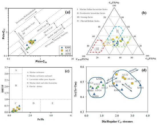 The ternary diagram of C19+20TT, C21TT, and C23TT can provide an alternative way to discriminate the various depositional environments of Carboniferous source rocks []. The predominance of C23TT leads most samples to be in the area of marine/saline lacustrine facies; two samples from the Altash Outcrop are located at the freshwater lacustrine facies and one sample from the Kushanhe Outcrop is located at the fluvial and deltaic facies (Figure 8b). This indicates that most samples were deposited in the marine saline water column but with the somewhat inputs of terrestrial freshwater and associated organic matter, since the Carboniferous source sequences were deposited in the marginal marine to shallow marine shelf environments [].