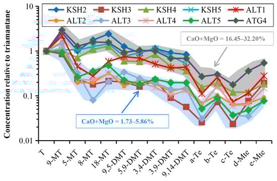 The first one includes samples ALT2–5 and KSH3 with the depletion of alkylated triamantanes and tetramantanes and carbonates (MgO + CaO = 1.73–5.86%). On the contrary, the second one includes samples KSH2, KSH4–5, and ATG4 with the enrichment of alkylated triamantanes and tetramantanes and carbonates (MgO + CaO = 16.45–32.20%). This is generally consistent with that suggested by the crossplot of Ts/(Ts + Tm) versus Dia/Regular C27 steranes (Figure 8d). A similar situation has been reported in the petroleum expelled from the calcareous and shaly source rocks within the Triassic Shublik Formation, Alaska North Slope []. The clay-mediated acid-catalyzed rearrangement of biological precursors during diagenesis is supposed to be responsible for this. Previous investigations have demonstrated that diamondoids with <3 cages are formed mainly by Lewis acid-catalyzed isomerization and rearrangement of cyclic hydrocarbon precursors [,,,], and diamondoids with ≥3 cages are generated by homologation of the lower alkyl-substituted at high pressures and temperatures in hydrocarbon reservoirs []. Moreover, hydrous pyrolysis experiments on modern immature sediments have demonstrated that the generation of diamondoids can be accelerated by the addition of clays and retarded by the presence of carbonates []. The clay catalysis effects on the isomerization of cyclic hydrocarbon precursors such as steranes may be feasible for the generation of parent diamondoids. The distribution of higher diamondoids for ALT1 presents the intermediate, although it is also depleted in carbonates as ALT2–5 (Figure 9). The specific organic matter input is supposed to be responsible for this as indicated by the lower ratio of C19+20TT/C23TT and higher percentage of regular C28 steranes (Table 3). More work is therefore needed to obtain a better understanding of the elements regulating the occurrence of higher diamondoids, which is beyond the main scope of the current study.