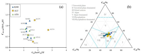 The crossplots of (a) C19−20TT/C23TT versus C24Ter/C26TT (b) Ternary diagram of C27 ααα20R, C28 ααα20R, and C29 ααα20R for rock samples from the outcrops in the piedmont of southwestern Tarim Basin.