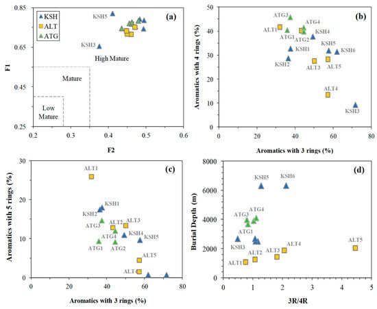 The crossplots of (a) F1 versus F2 indicating the highly matured Carboniferous source rocks, (b,c) showing the negative correlations between aromatics with 3 rings and aromatics with 4–5 rings, and (d) showing the positive correlation between the 3R/4R ratio with burial depth increasing.