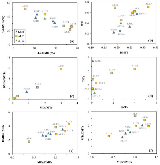 The unique chemical structures of diamondoids allow them to be resistant to thermal degradation in petroleum reservoirs, and hence play a crucial role in evaluating the thermal maturity levels [,]. Diamondoids isomers with alkyl substitution on bridgehead carbons are supposed to be thermally more stable than those on secondary carbons [,]. The thermal maturity indices of methyladamantanes (MAI), methyldiamantanes (MDI), dimethyldiamantanes (DMAI), ethyladamantanes (EAI), and methyltriamantanes (MTI) have been widely used to constrain the thermal maturity levels of source rocks and associated crude oils [,,,]. The calculated %Ro value based on MDI is 1.26–1.36 for KSH2–4, 1.38–2.02 for ALT1–5, and 1.45 for ATG4 (Table 4), indicating the late and highly matured source sequences within the lower and middle Carboniferous on the outcrops. The Altash samples are generally more matured than the Kushanhe and Aitegou samples as indicated by the enrichment of 4,9-DMD relative to 3,4-DMD (Figure 12a) and greater values of MTI and DMTI (Figure 12b).