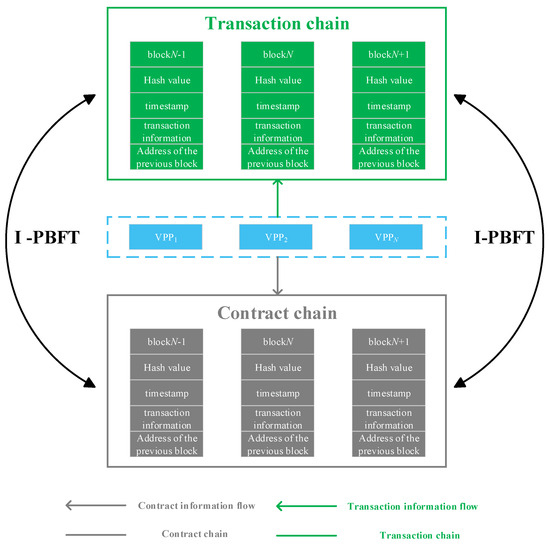 (1) By storing transaction information and contract information separately, it significantly reduces the capacity of each block and accelerates the transaction speed. Expanding the blockchain structure from a single chain to a dual chain enhances the credibility of the data. The dual-chain blockchain architecture includes a transaction chain and a contract chain, both of which use weakly centralized alliance chain technology, which ensures efficient and safe transactions while reducing transaction costs. Among them, the blocks of the transaction chain only save the point-to-point transaction decisions of VPPs, which are carried out based on the distributed electricity transaction mechanism; the blocks of the contract chain record the VPP transaction contracts and verify the validity of the contract information.