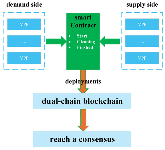 The multi-VPP power sharing trusted transaction mechanism based on dual-chain blockchain proposed in this paper will operate based on smart contracts, as shown in Figure 3, and the participating subject VPPs can invoke smart contracts on the blockchain platform to conduct transactions.