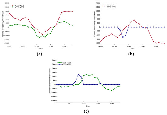 The optimization results of each VPP carrying out P2P electric energy interaction are shown in Figure 4. From the figure, it can be seen that in the time periods of 00:00–09:00 and 16:00–24:00, VPP1 has a surplus of electric energy and plays the role of a seller to supply electric energy to other VPPs. In the 06:00–10:00 time period, VPP2 buys electric energy from VPP3; in the 09:00–16:00 time period, VPP2 shares electric energy to VPP1. In the 09:00–16:00 time slot, VPP3 sells electric energy to VPP1. As a result, this multi-VPP power sharing credible trading mechanism promotes the production motivation of the seller and stimulates the consumption potential of the buyer, effectively improving the level of resource sharing.
