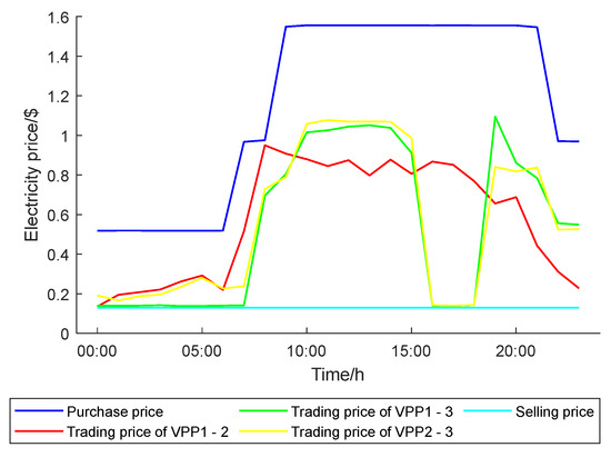 The electricity trading price of each VPP subject is shown in Figure 5. The transaction price determined based on Nash negotiation remains within the regional electricity price limit throughout the dispatch cycle. Especially during the off-peak service hours, the price is obviously at a low level, effectively avoiding the risk of over-dependence on the superior grid. It can be seen that the Nash negotiation between VPPs in the region can not only purchase energy at a more economical price but also dispose of excess power in a timely manner and achieve optimal control of operating costs.