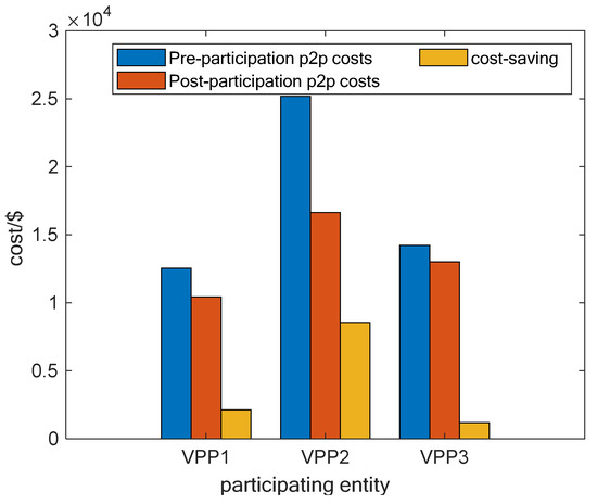 A graph comparing the independent operating cost of each VPP after the clearing of electricity trading among VPPs with the operating cost after conducting p2p trading is shown in Figure 6. As can be seen from the figure, the running cost of each VPP is reduced to different degrees after power sharing. The details are shown in Table 2. Among them, VPP1 saves cost 2129.704$, VPP2 saves cost 8549.638$, and VPP3 saves cost 1188.54$. The results show that the transaction clearing method proposed in this paper improves the participation motivation of each market member and maximizes social welfare.