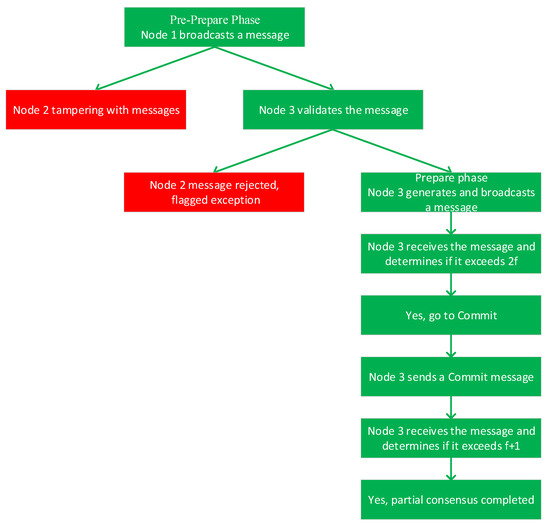 It is assumed that common node 2 is the evil-doing slave node. In the Pre-Prepare phase of local consensus, node 1 broadcasts a Pre-Prepare message to other ordinary nodes including node 2. After receiving the message, node 2 intentionally tampers with the message content in an attempt to interfere with the consensus process. However, after receiving the message, node 3 strictly verifies the message based on the authentication protocol based on zero-knowledge proof with the Diffie–Hellman algorithm. Since node 2’s altered message cannot pass the authentication, other nodes will reject the message and mark node 2 as an abnormal node. In the Prepare phase, node 3 generates a Prepare message based on the correct Pre-Prepare message and broadcasts it to other nodes. At this time, due to the malicious behavior of node 2, it may not send the correct Prepare message, but this does not affect the consensus among other nodes. When node 3 receives more than 2f (f = 1 in this scenario) correct Prepare messages, it enters the Commit phase. During the Commit phase, node 3 continues to send Commit messages following the consensus process. Similarly, the local consensus is completed as soon as the node receives more than f + 1 correct Commit messages. Since the malicious behavior of node 2 is identified and excluded, normal nodes can successfully complete the local consensus, ensuring the consistency and integrity of the transaction data. The flow is shown in Figure 7.
