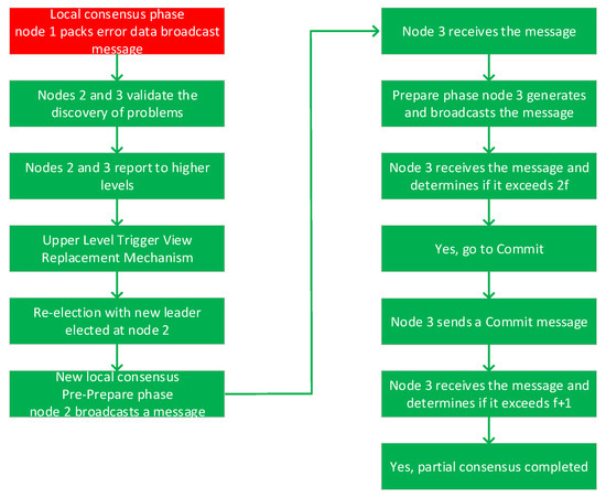 Suppose node 1 (the leader node of the lower consensus group A and also a member of the upper consensus group) commits an evil act during the consensus process. During the local consensus phase, node 1 intentionally packages wrong transaction data and broadcasts a Pre-Prepare message to other nodes. After receiving the message, the other nodes discover through the authentication protocol that the transaction data in the message is faulty and does not satisfy the consistency requirement. At this time, nodes 2–3 report the situation to the upper layer consensus set, triggering the view change mechanism. After receiving the report, the upper layer consensus set will revisit the situation of the lower layer consensus set A. According to the consensus set leader node election strategy, a reliable node from nodes 2–3 is re-elected as the new leader node, assuming that node 2 is elected as the new leader node. The new leader node will reorganize the local consensus process to generate and broadcast messages according to the correct transaction data from the Pre-Prepare phase. The other normal nodes will respond positively and redo the Prepare and Commit phases. In the re-conducted consensus process, the local consensus can be successfully completed due to the correct guidance of the new leader node and the collaboration of other normal nodes. Subsequently, the new leader node submits the local consensus result to the upper consensus set and participates in the global consensus process to ensure that the whole distributed power transaction can continue to proceed normally, avoiding transaction failures or data errors due to the master node’s evil. The process is shown in Figure 8.