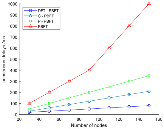 Consensus delay is a key indicator for evaluating the strengths and weaknesses of the consistency algorithm, which indicates the time spent from the client initiating the transaction request to the successful confirmation of the transaction. The lower the delay, the shorter the execution time of the consensus algorithm, the higher the consensus efficiency, the faster the network nodes reach agreement, and the system operation is more secure, stable, and efficient. In order to verify the superiority of the I-PBFT consensus algorithm proposed in this paper, the method of this paper is compared with three common consensus algorithms, namely, PBFT, P-PBFT, and C-PBFT, to conduct a delay comparison test. The results are shown in Figure 9, where it can be observed that the consensus latency of the PBFT algorithm is significantly higher than that of the C-PBFT, P-PBFT, and I-PBFT algorithms for the same number of nodes. The reason is that the latter three algorithms utilize the group consensus mechanism, which greatly reduces the communication cost in the consensus process. With the gradual increase in the number of nodes, the latency of all four algorithms shows an upward trend. However, it is worth noting that the I-PBFT algorithm shows the most moderate growth. For example, when the number of nodes is 150, the consensus latency of the I-PBFT algorithm is reduced by about 62% compared to the P-PBFT algorithm, and by about 72% compared to the C-PBFT algorithm.