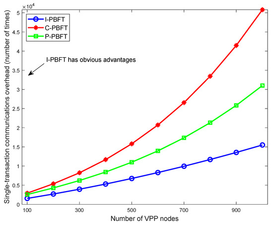 Under laboratory conditions, this paper launched a test for the single transaction communication overhead of three consensus algorithms in a distributed electricity trading scenario. In the experiment, 100 VPP nodes are first divided into 20 lower consensus groups, and then the test samples are expanded in the scale of 100 nodes per increment. By analyzing the simulation results in Figure 10, it can be found that with the increase in the number of VPP nodes, the communication overheads of all three algorithms show an increasing trend. Among them, the communication overhead of the I-PBFT algorithm is lower than that of the C-PBFT and P-PBFT algorithms in all test phases, and the larger the node size is, the more significant its advantage is. This is because I-PBFT adopts a two-layer consensus mechanism, in which only the lower consensus set needs to complete the initial consensus in each round, and then the reliable upper consensus set carries out the secondary confirmation. This mechanism not only ensures the accuracy of the consensus but also reduces the communication overhead. When the number of nodes is extended to 300, the communication overhead of I-PBFT is reduced by 36.5% compared to P-PBFT and 52.1% compared to C-PBFT; when the number of nodes reaches 500, the communication overhead of I-PBFT is reduced by 38.6% and 57.3% compared to P-PBFT and C-PBFT, respectively. This indicates that the I-PBFT algorithm has a significant advantage in communication efficiency optimization in a certain scale distributed electricity trading network.