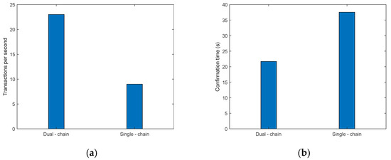 Dual-chain vs. single-chain blockchain performance comparison: (a) number of transactions processed per second; (b) average confirmation time per block (results of the simulation of the models in this paper).