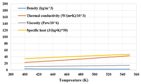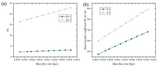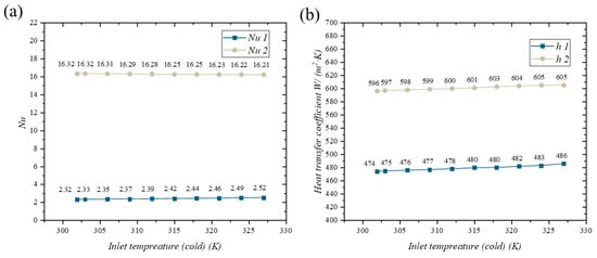 Similarly, the convective heat-transfer coefficients (h1 for the cold fluid and h2 for the hot fluid) follow the same trend, with the hot fluid’s coefficient being higher. However, the Nusselt number of the hot side shows a slight decrease as the inlet temperature of the cold side increases. This is because, as shown in Figure 1, the thermal conductivity increases significantly with the increase in temperature.