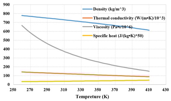 The thermodynamic characteristics of cyclopentane play a vital role in determining the efficiency and operational performance of the heat exchanger. As depicted in Figure 1, the density, thermal conductivity, viscosity, and specific heat capacity of gaseous cyclopentane exhibit distinct variations across different temperatures. Similarly, Figure 2 illustrates the corresponding changes in these thermodynamic properties for liquid cyclopentane. A notable observation from these figures is the substantial difference in density between the liquid and gaseous phases of cyclopentane. Specifically, at a temperature of 290 K, the density of liquid cyclopentane is approximately 740 kg/m3, whereas the density of gaseous cyclopentane is significantly lower, at around 2.5 kg/m3. Moreover, the viscosity of liquid cyclopentane is markedly higher than that of its gaseous counterpart, with the viscosity of liquid cyclopentane being several orders of magnitude greater than that of gaseous cyclopentane at the same temperature.