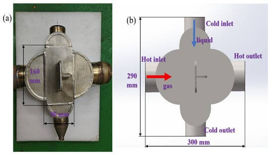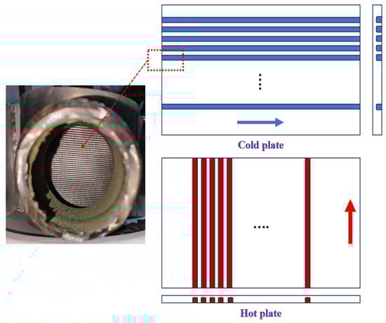 In this study, the printed-circuit heat exchanger (PCHE) utilizes a cross-flow configuration, as illustrated in the structural schematic diagram (Figure 3). The flow direction of gaseous cyclopentane is indicated with the red arrow, while the flow direction of liquid cyclopentane is denoted with the blue arrow. This cross-flow design effectively enhances the relative velocity between the two fluids and facilitates the development of turbulence. Based on principles of fluid mechanics, the heat-transfer coefficient in turbulent flow can be 2 to 4 times higher than that in laminar flow, thereby significantly improving the overall heat-transfer performance.