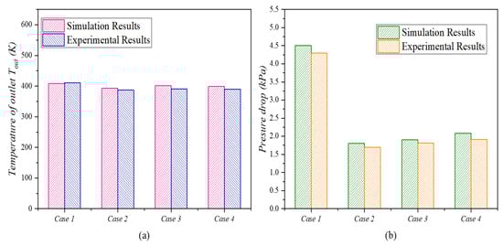 Validating the model is crucial to ensuring simulation reliability. When the heat exchanger’s outlet temperature data from experiments and simulations were compared, the maximum error was within 5%, the minimum error was nearly 0%, and the average error was around 2.5%. Regarding the pressure-drop data, the model’s maximum deviation was within 10%. After numerous data points were analyzed, the minimum error was about 1%, and the average error was approximately 5%. As Figure 5 shows, the comparison of experimental and simulation results revealed that the maximum difference in the outlet temperature was within 5%, and the maximum pressure-drop deviation was within 10%. These error values effectively quantify the model’s accuracy. Table 3 presents a detailed comparison of the thermal–hydraulic parameters obtained from both the experiment and simulation under the Case1 operating conditions. The data indicate a close alignment between the experimental and simulation values across various parameters. For instance, the experimental value for the hot-side outlet temperature was 411 K, compared to the simulation value of 408 K; the experimental pressure drop on the hot side was 5 kPa, whereas the simulation result was 4.3 kPa. Overall, the model developed in this study was rigorously validated through experimentation, demonstrating high accuracy and providing a robust foundation for further simulation analysis.