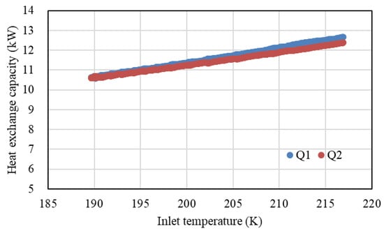 With the rise in inlet temperature, the heat-transfer capacity of the regenerator exhibits an upward trend. In this context, Q1 denotes the heat released via the hot fluid, while Q2 signifies the heat absorbed via the cold fluid. As illustrated in Figure 6, the difference between Q1 and Q2 was minimal, remaining within a 5% margin across various operating conditions. This suggests that the heat exchanger experiences minimal heat loss during the transfer process, demonstrating excellent heat-transfer and thermal retention capabilities. A closer examination of the experimental data indicates an approximate linear correlation between the heat-transfer capacity and the inlet temperature. Within a specific temperature range, an increase of 10 K in the inlet temperature results in a corresponding rise in the heat-transfer capacity by approximately 10% to 15%.