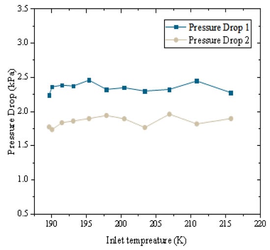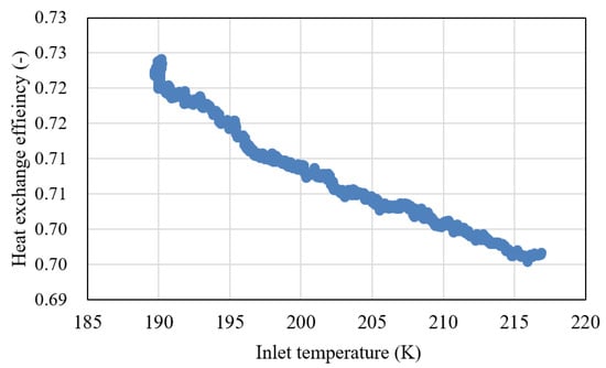 where represents the heat-transfer efficiency. As observed, the efficiency of heat transfer in the PCHE diminishes with an increase in the inlet temperature. This trend can be attributed to the fact that a higher inlet temperature leads to a greater temperature differential between the hot and cold fluids, thereby enhancing the driving force for heat transfer and consequently increasing the heat-transfer capacity. However, concurrently, heat losses at elevated temperatures also escalate, such as those due to heat dissipation through the walls of the heat exchanger. In accordance with heat-transfer principles, heat loss is proportional to the square of the temperature difference. Thus, as the temperature difference widens, heat loss escalates at a more rapid pace, which, in turn, results in a decline in heat-transfer efficiency. The peak heat-transfer efficiency achieved with this heat exchanger was 72%, which occurred when the inlet temperature was 190 K under operating conditions with a relatively lower inlet temperature. This indicates that the heat exchanger exhibits robust heat-transfer performance within a specific range of operating conditions and is capable of fulfilling the requirements of practical engineering applications. Compared with the research on heat exchangers in the ORC cycle, the PCHE in this study achieved a thermal efficiency of 72%, while the fin-protracted heat exchanger achieved a thermal efficiency of 39.6% [29]. Therefore, this study offers obvious advantages.