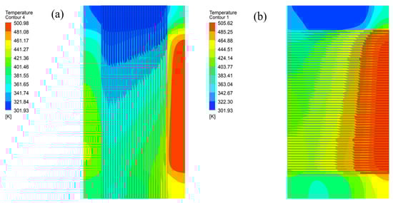 Figure 9b illustrates a similar temperature gradient in the hot fluid’s flow channel, with higher temperatures near the lower side (adjacent to the cold fluid inlet) and lower temperatures on the upper side. However, the overall temperature distribution of the hot fluid was relatively uniform, with a standard deviation of about 3–5 K. This suggests that the heat exchanger design effectively maintains temperature uniformity for the hot fluid, reducing the risk of localized overheating or overcooling. Such uniformity is crucial for enhancing the overall performance of the heat exchanger.