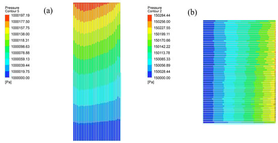Pressure-distribution nephograms of PCHE: (a) cold fluid; (b) hot fluid.