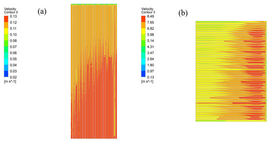 Temperature-distribution nephograms of PCHE: (a) cold fluid; (b) hot fluid.