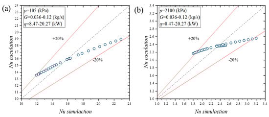 The derived heat-transfer correlations were validated against 34 simulation results. As illustrated in Figure 14a,b, which compares the correlation predictions with the simulation outcomes, the accuracy of the correlations is within a 20% margin of error (red line). For the hot fluid, across various operating conditions, the relative errors between the predicted Nusselt numbers and the simulated values predominantly cluster around 15%. For the cold fluid, these relative errors generally remain within 18%. This level of accuracy demonstrates that the derived correlations can reliably forecast the heat-transfer performance of cyclopentane on both the hot and cold sides of the printed-circuit heat exchanger under diverse operating scenarios. For Nu1 (corresponding to the hot fluid), its values range from a minimum of approximately 11.93 to a maximum of around 22.89. As for Nu2 (associated with the cold fluid), the minimum value is roughly 1.80, and the maximum is about 3.20. The application range of the proposed heat-transfer correlations is as follows: using cyclopentane as the working fluid, with a pressure of 105 kPa, a mass flow rate of 0.036–0.12 kg/s, and a cooling capacity of 8.47–20.27 kW; and with a pressure of 2100 kPa, a mass flow rate of 0.036–0.12 kg/s, and a heating capacity of 8.47–20.27 kW. Consequently, these correlations provide a robust theoretical foundation for the design and performance prediction of heat exchangers in practical engineering applications.