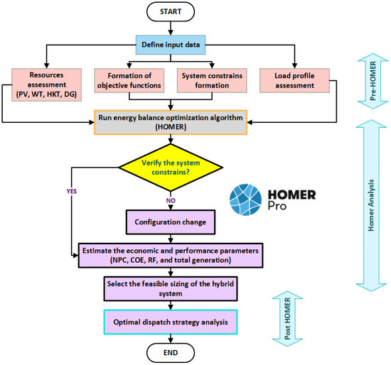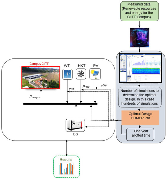 In the methodological analysis of this research, the Homer Pro version 3.16.2 design tool is employed, as recommended by several academics and researchers for its effectiveness and excellent features. This tool features a continuously updated information structure for equipment currently on the market, enabling simulations under various conditions. Homer Pro includes catalogs with equipment details and parameters, the same ones currently available on the market. This is precisely one of the strengths of using this tool, in addition to providing a wide range of options. It is also possible to establish direct links with MATLAB to display the main results in a more organized visual format with more customized graphic styles. It also allows for calibrations or optimizations according to the researcher’s presentation interests and the identified constraints. This tool is also handy for conducting economic studies subsequent to the hybrid system design or for determining the most optimal condition that links the technical and financial aspects. The scheme presented below in Figure 2 represents the methodological analysis of this study.