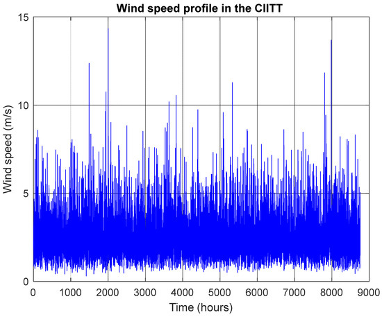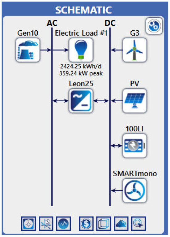 Figure 3 presents a hybrid system comprising renewable energy sources (wind, PV and hydrokinetic) and non-renewable energy sources (a diesel generator). The renewable energy initially contribute 24-volt direct current to the system, and then, through an inverter, the power is distributed to the buildings comprising the CIITT in alternating current. The analysis in this study is isolated; therefore, the sizes of the equipment containing the hybrid system are specified.