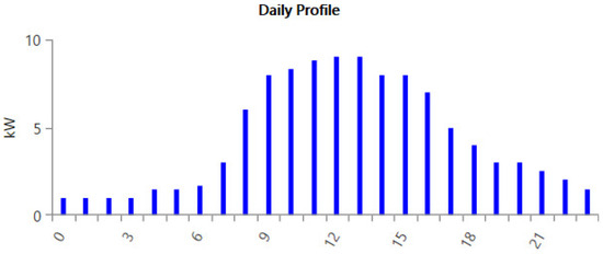It is important in electrification studies to consider the energy demand at the site under analysis. In the case of CIITT, the total load previously determined in the previous research provided in reference [74] was evaluated, and its general data were entered into the Homer Pro design tool. Hourly demand data specific to the sector were utilized and input into the Homer Pro tool, as illustrated in Figure 4. The highest demand is recorded during the weekday between 8:00 and 17:00, as researchers commonly work during these hours. However, attention should not be paid to the rest of the day, when some activities are also carried out but which require lower energy consumption. The highest consumption peaks are recorded during the hours around noon, with values reaching 9 kW. This demand behavior leads to the prediction that the size of the storage system will not be significant but will be required to guarantee the autonomy of the energy system. Should demand increase or the hybrid system fail to produce enough power for unusual reasons, the backup system will immediately intervene. Even the diesel generator, which has been operating for several years, will be essential to provide sufficient power to the research center.