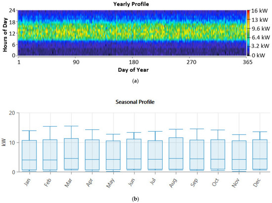 Figure 5 illustrates the annual power demand in relation to daylight hours. Figure 5a displays a yearly spectrogram of daily demand behavior, while Figure 5b presents the seasonal profile in monthly box plots, illustrating a peak power of 17.8 kW in February and March.