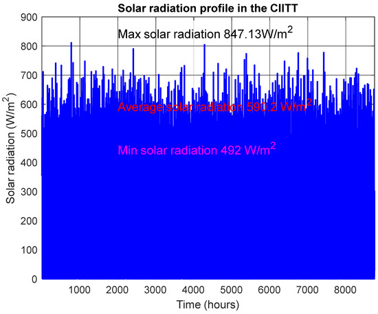 The photovoltaic module considered in this study is monocrystalline, 9-bushbar, 166 mm cells, 24 V, 230 Wp. It is suitable for installation on building roofs, even in open spaces, and is considered both interesting and valuable in current implementations. It is easily connected to other equipment, such as modern inverters and charge controllers, and adequate ventilation levels are provided in current spaces. The technical details are presented in Table 1. Solar radiation is relatively high at the site throughout the day but especially during midday. The output power of the photovoltaic solar system is presented below in Equation (1):