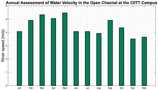 To obtain the water velocity profile, measurements were taken in half of the 75 cm wide open channel. The maximum velocity is 3.8 m/s, and the average is 3.3 m/s. These velocities are adequate, despite the narrow channel. The hydrokinetic turbine can be easily installed, and in the future, a cascade of turbines can be established in suitable locations. The hydrokinetic turbine was selected to ensure market availability and is included in the equipment catalog in the Homer Pro tool. Its characteristics are detailed in Table 2.
