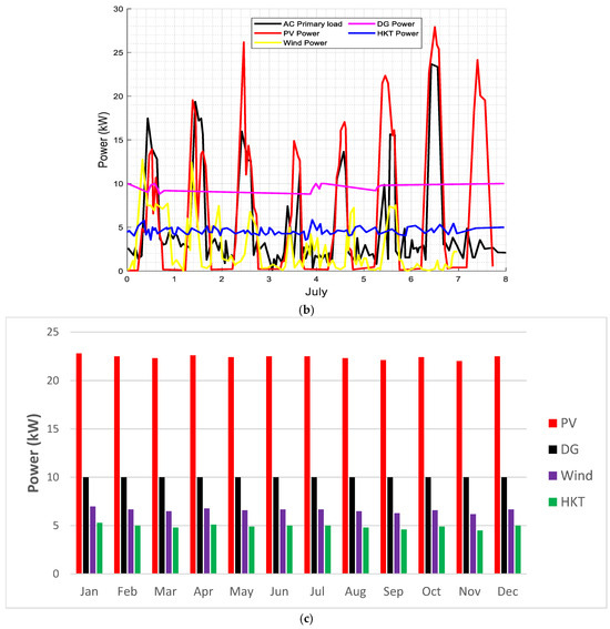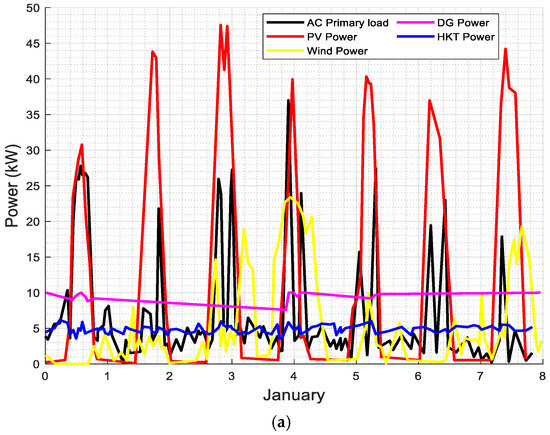 - In this scenario, the load demand surpasses the total power output of the hybrid system. At this point, the battery begins discharging its stored energy, as represented in Equation (12) [77].