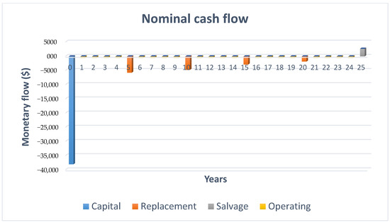 The hybrid system’s battery bank must operate continuously for the system’s 25-year lifespan. It is recommended that the batteries be replaced three times during this period. The battery bank is determined using Equation (8).