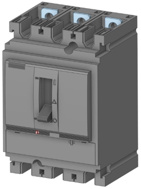 A 3D model of the tested molded case circuit breaker with a rated current of 250 A together with power cables.