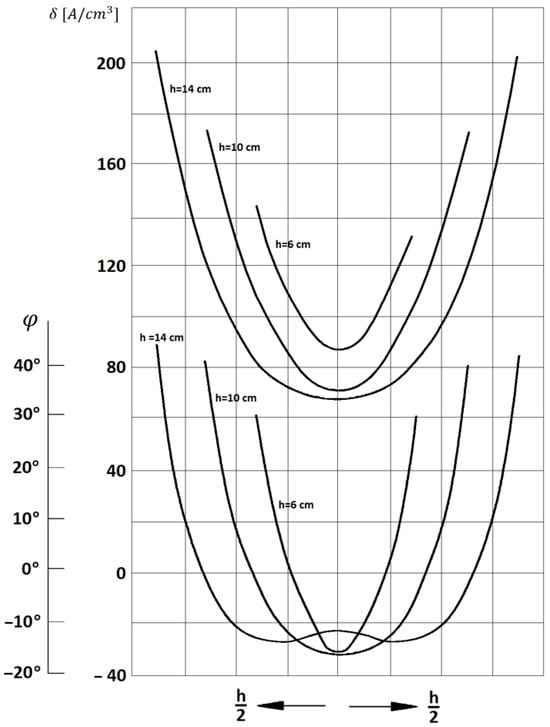 Distribution of current density δ and phase φ (relative to voltage) in current paths with rectangular cross-section with dimensions b = 10 mm and different values of h [16,21].