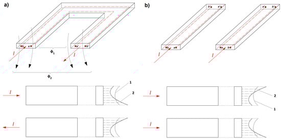 Distribution of current density in current paths in the case of (a) current flow in the opposite direction, (b) current flow in the same direction, 1—without the proximity effect, 2—the proximity effect phenomenon [16,21].