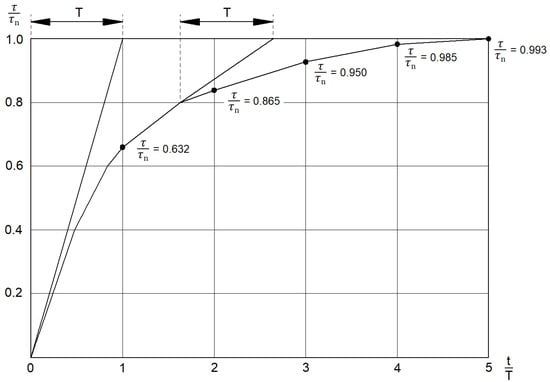 The first of the aforementioned cases allows for observing the increases in heat generated and released to the environment until thermal equilibrium is achieved. The time necessary for this phenomenon to occur is “five time constants T”, as shown in Figure 7.